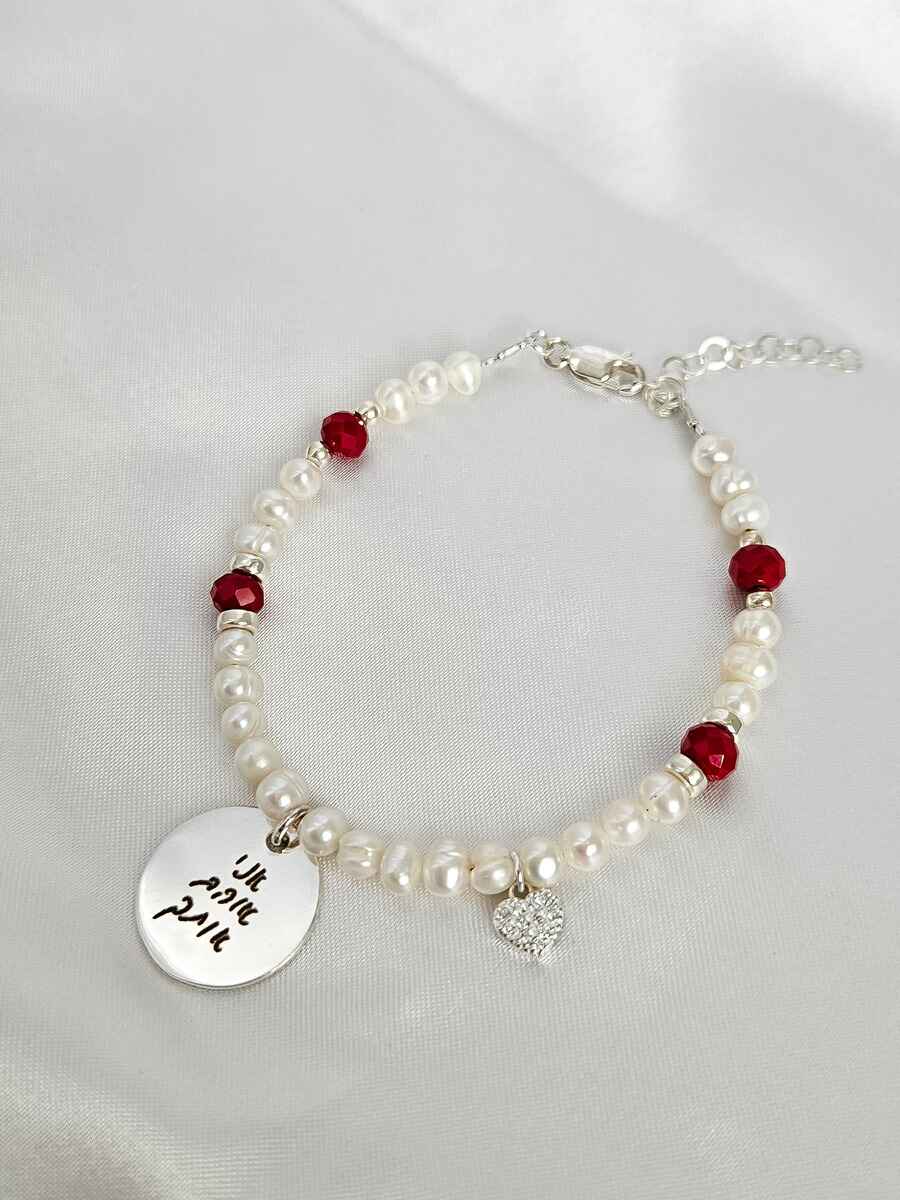 עם פנינים טבעיות בצורתן הגולמית, קריסטלים ותליון לב המשובץ זירקונים.